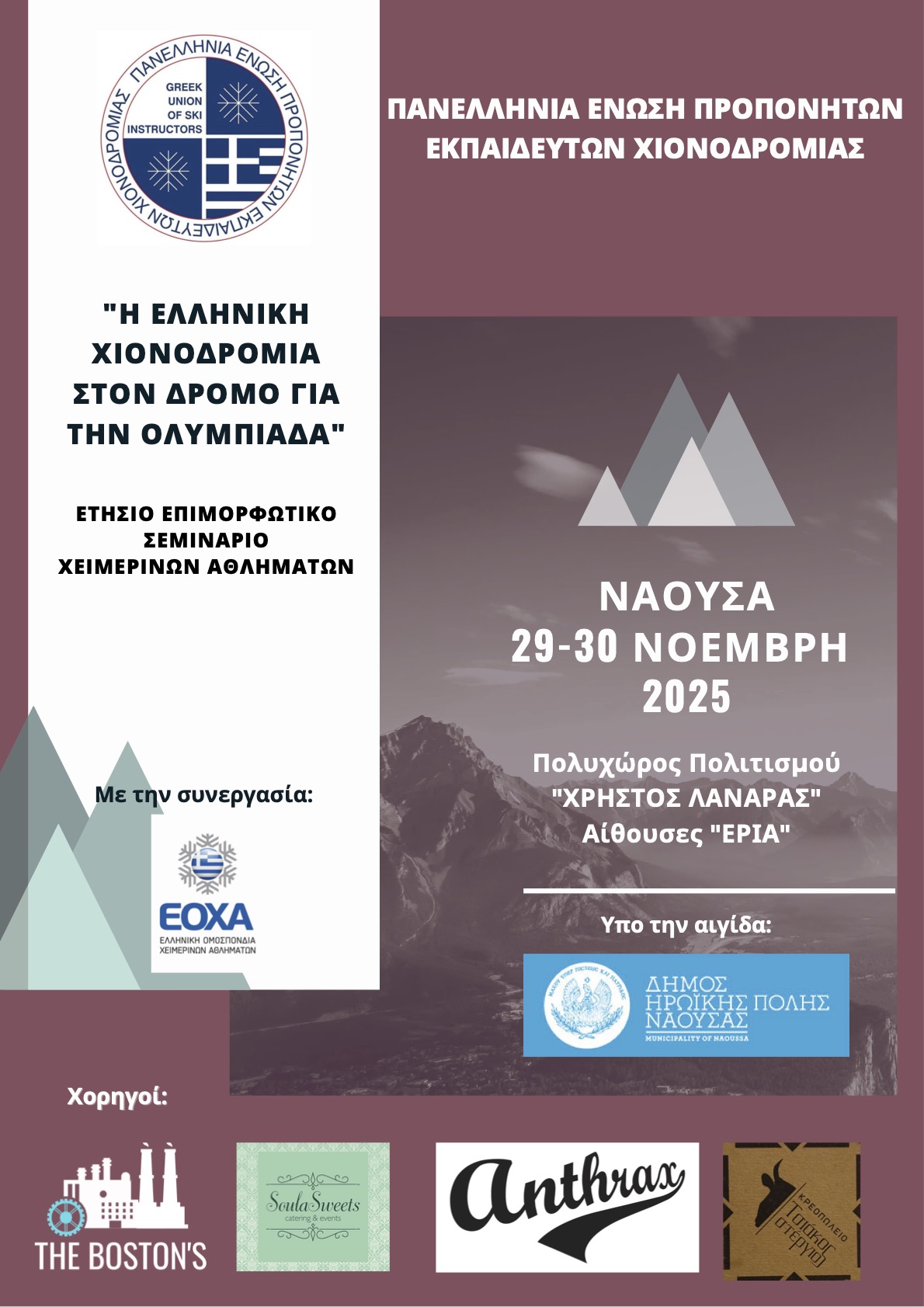«Η Ελληνική Χιονοδρομία στον δρόμο για την Ολυμπιάδα» Ετήσιο Επιμορφωτικό Σεμινάριο Χειμερινών Αθλημάτων Νάουσα 29-30 Νοεμβρίου 2025 ΠΡΟΓΡΑΜΜΑ ΣΕΜΙΝΑΡΙΟΥ